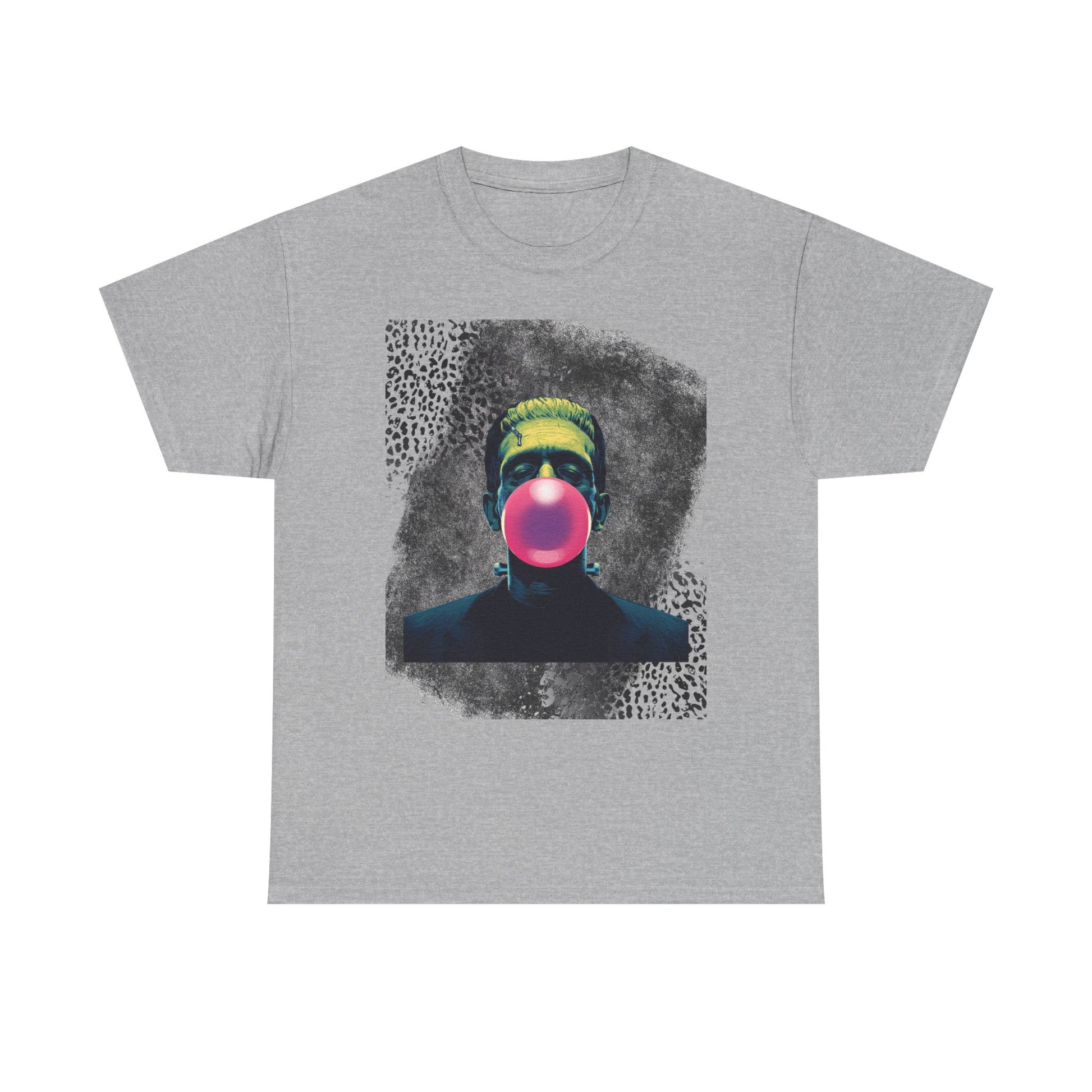The Frankenstein Bubblegum TeeShirt is a fun and quirky addition to any wardrobe. It exudes a playful and whimsical vibe, making it perfect for those who enjoy unique and creative fashion. This TeeShirt is relevant for Halloween, comic-con events, and fans of the horror genre.